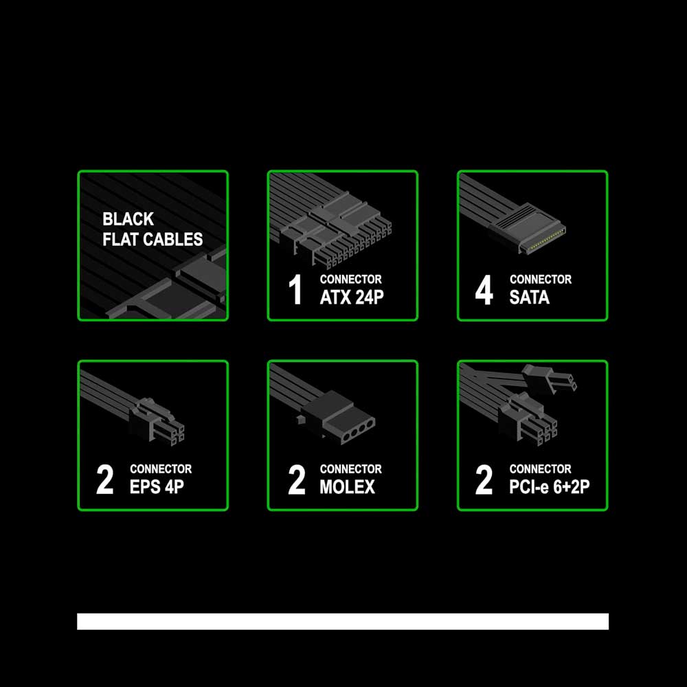 Contém PFC Ativo, que reduz perdas de energia e aumenta a eficiência, reduzindo também a geração de calor. Gerencia a função bivolt de forma automática. Os cabos são reforçados evitando torções ou quebras dos fios.