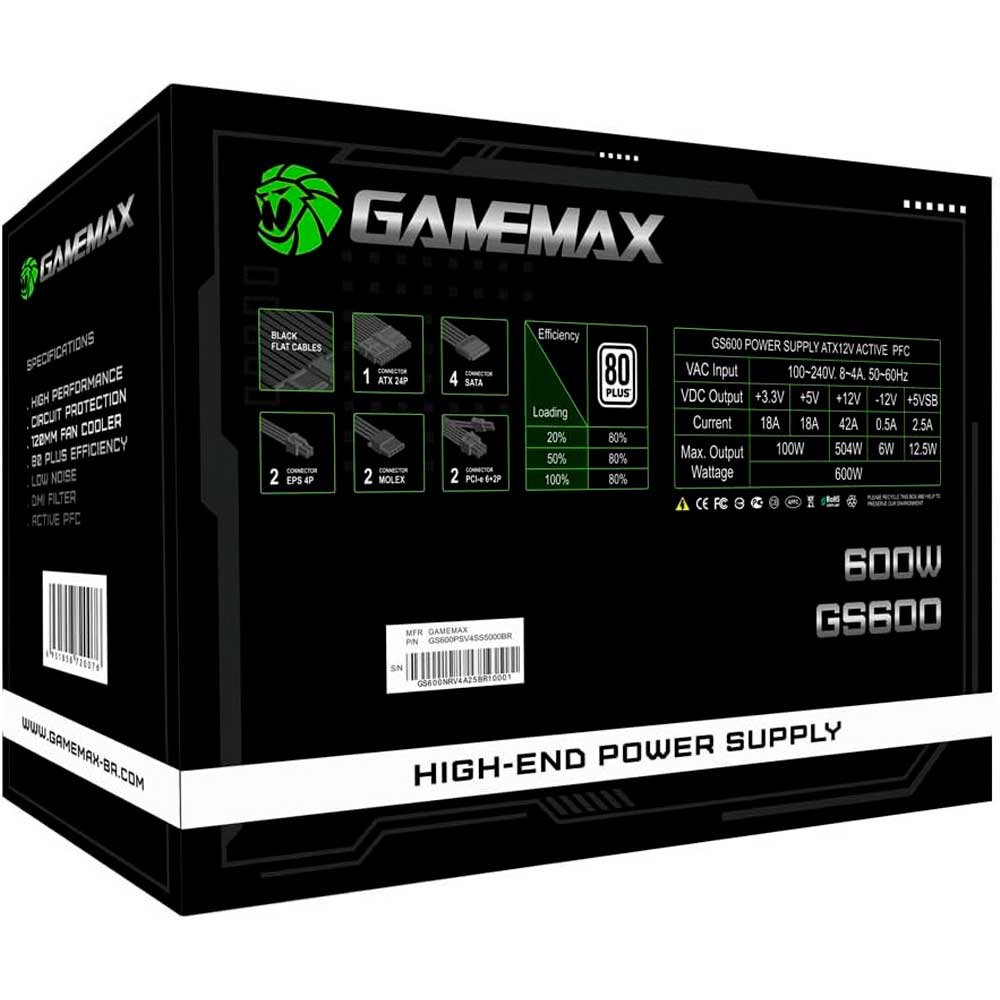 Fonte Gamemax GS600, 600W, 80 Plus White, PFC Ativo, Black